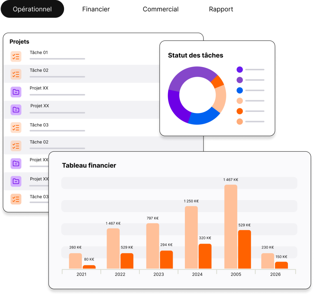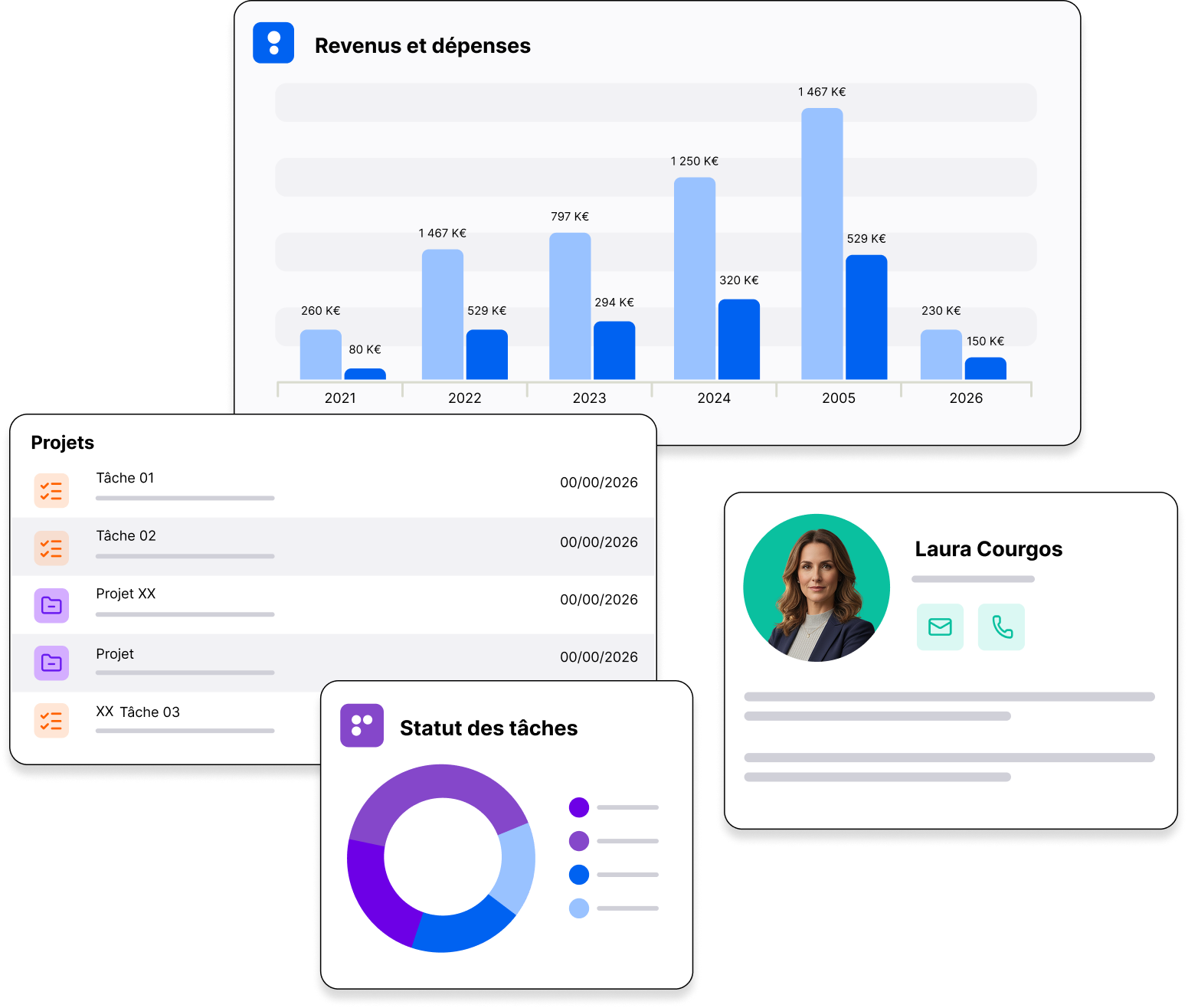 Absolument. Vous démarrez avec le module qui répond à votre besoin prioritaire — CRM, projets ou facturation — et vous ajoutez les autres à votre rythme. Pas d’engagement sur l’ensemble, vous construisez votre outil au fur et à mesure.